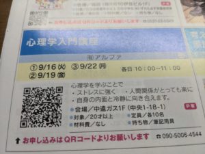 街ゼミ開催 投稿日: 2025-08-18 (2025-08-08) 投稿者: %s yamachan 今回で3回連続の街ゼミ参加となります。 毎回 ご好評を頂いております。 街ゼミ「心理学講座」 本日 新聞乗り込みされました。 宜しければご参加ください。 1.開催日 ⓵9月16日(火) ⓶9月19日(金) ⓷9月22日(月) 時間は何れも 10:00 ~ 11:00 2.会場 中遠ガス1F(掛川市中央1-18-1) 3.内容 心理学を学ぶことで ・ストレスに強く ・人間関係がとっても楽に ・自身の内面と冷静に向き合えるようになります。 4.対象 20歳以上 定員各10名 持ち物 筆記用具 5.参加費 無料 お申込み、お問い合わせはこちらから Tweet